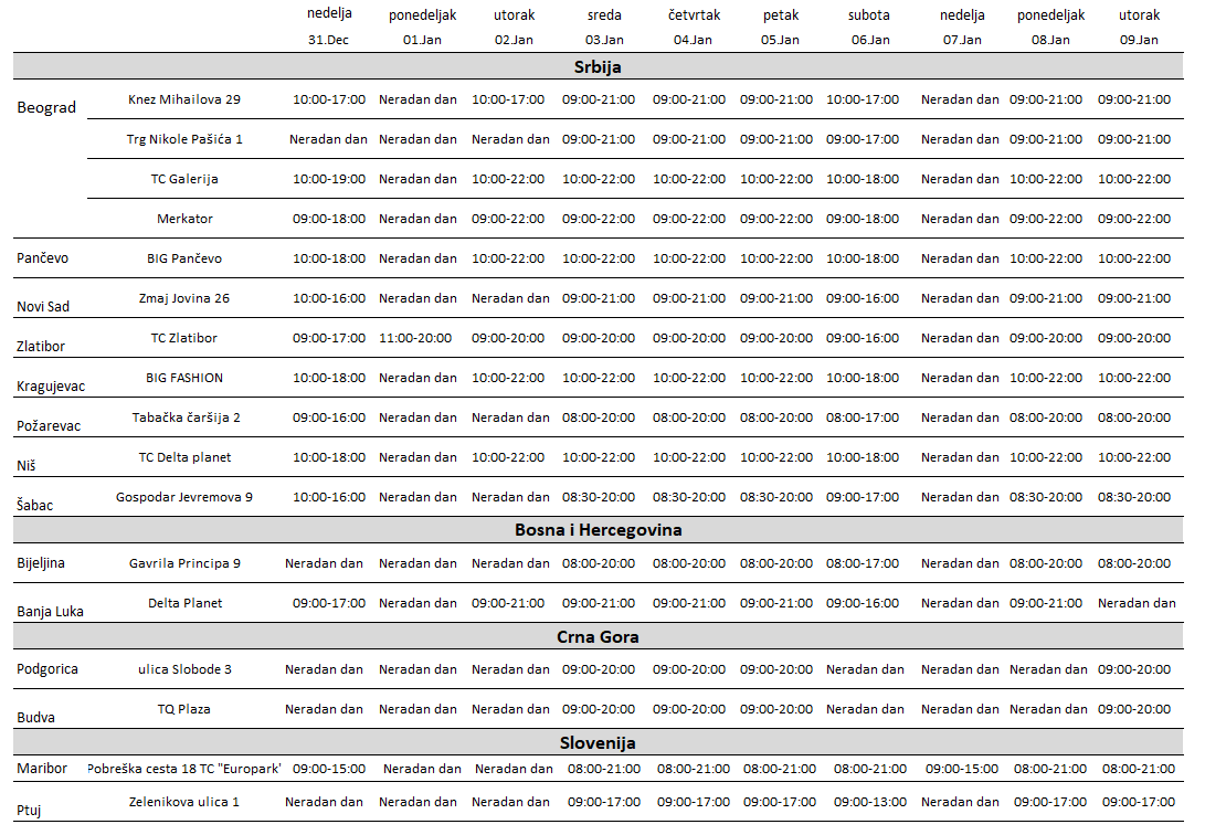 U toku predstojećih novogodišnjih i božićnih praznika LUNA maloprodajni objekti će raditi prema izmenjenom radnom vremenu: