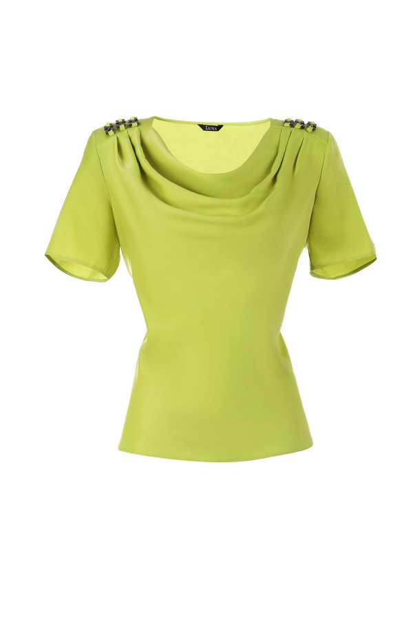 Jednobojna bluza sa kratkim rukavima. Oplemenjena je naborima u zoni dekoltea a efektni detalji na ramenima čine model posebnim i jedinstvenim. Savršeno se kombinuje sa suknjama i pantalonama iz iste kolekcije, a uz Luna cipele i nakit postižete odlično stilizovan look.