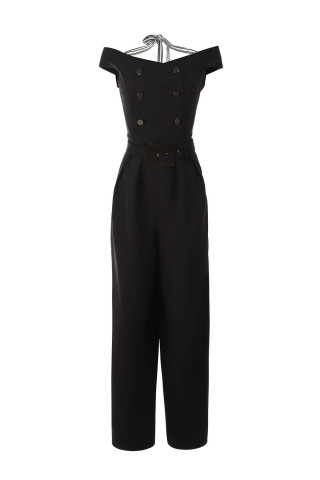 "Unikaten kombinezon črne barve je popolna kombinacija udobja in elegance. Poseben čar kombinezonu dajejo naramnice s črtami črno bele barve, ki se zavežejo okoli vratu, široke hlačnice in okrasna zaponka v pasu ustvarja osupljivo silhueto s pomočjo zadrge ob strani. Višina modela: 176 cm"