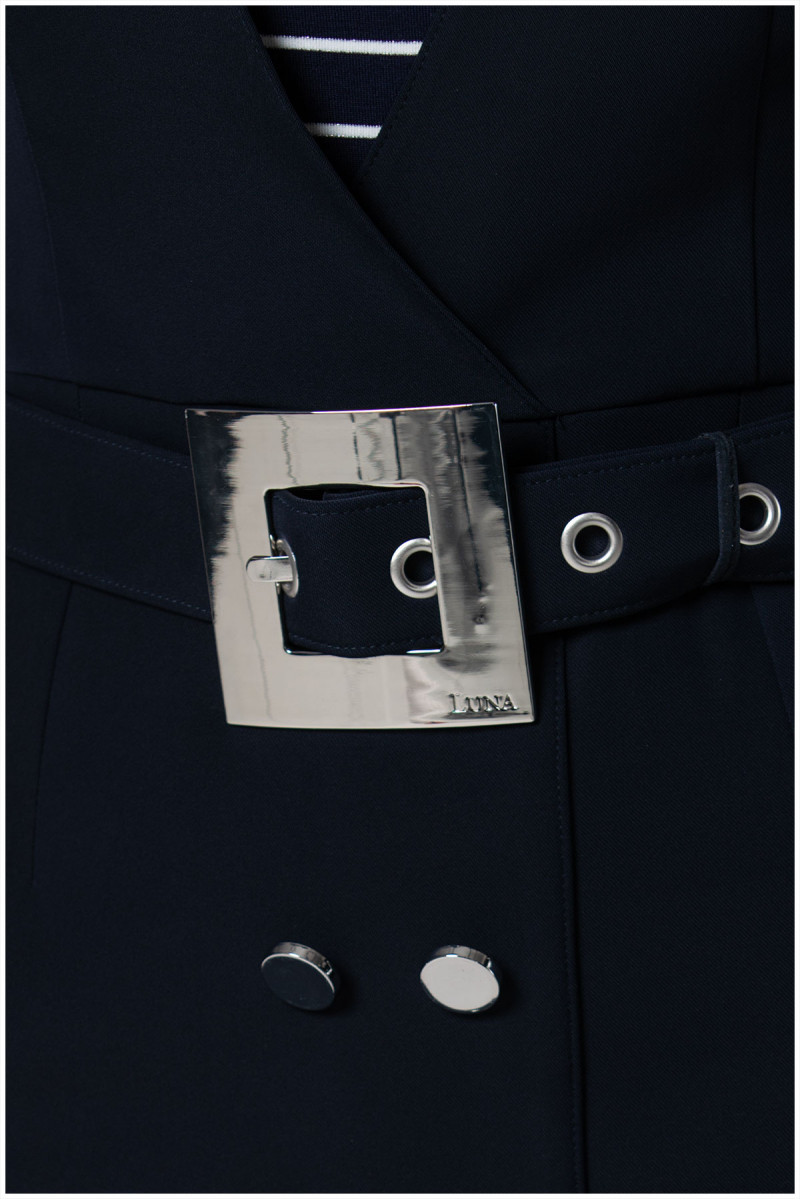 Kratka obleka v mornarsko modri barvi je oplemenitena z elegantnimi gumbi.