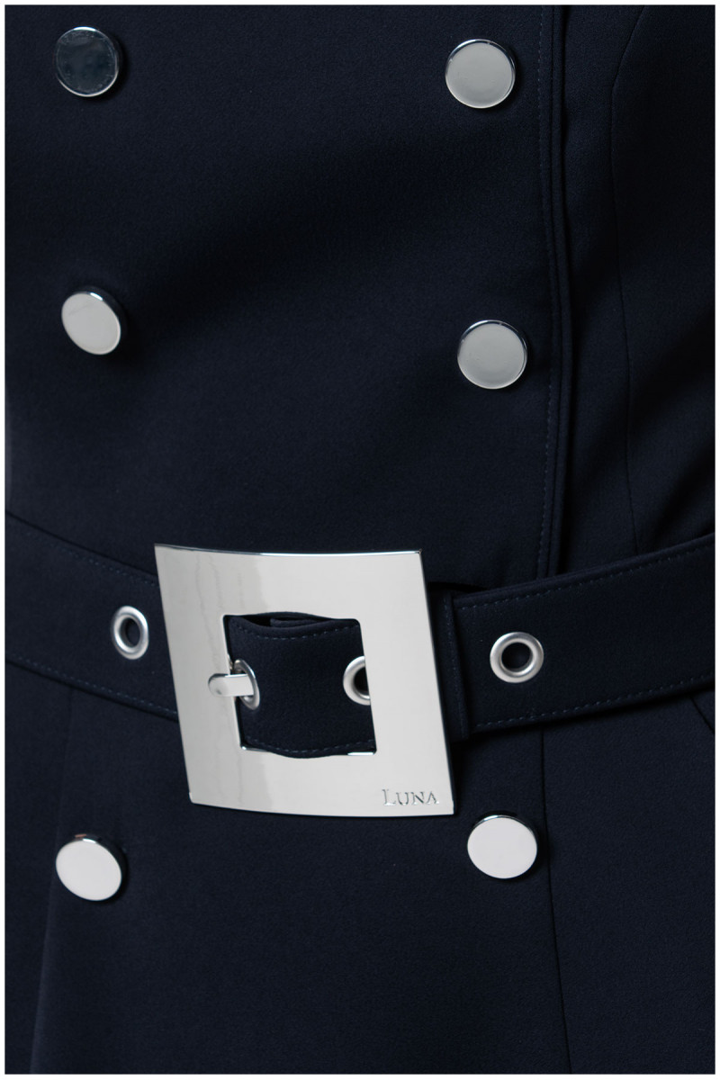 Kratka obleka v mornarsko modri barvi je oplemenitena z elegantnimi gumbi.