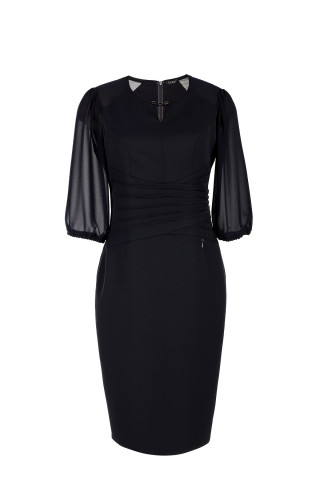 Elegantna modra obleka s 3/4 rokavi, ki po kroju sledi liniji telesa in poudari vašo ženstvenost. V predelu pasu je okrašena z naborki, ki dodatno poudarijo pas. Dodajte še nakit Luna in torbico in pripravljeni ste na pomemben dogodek.