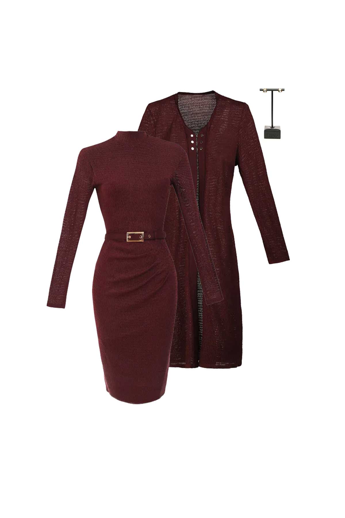 Ženstvena bordo obleka, ki popolnoma sledi liniji telesa in poudari vaš pas.