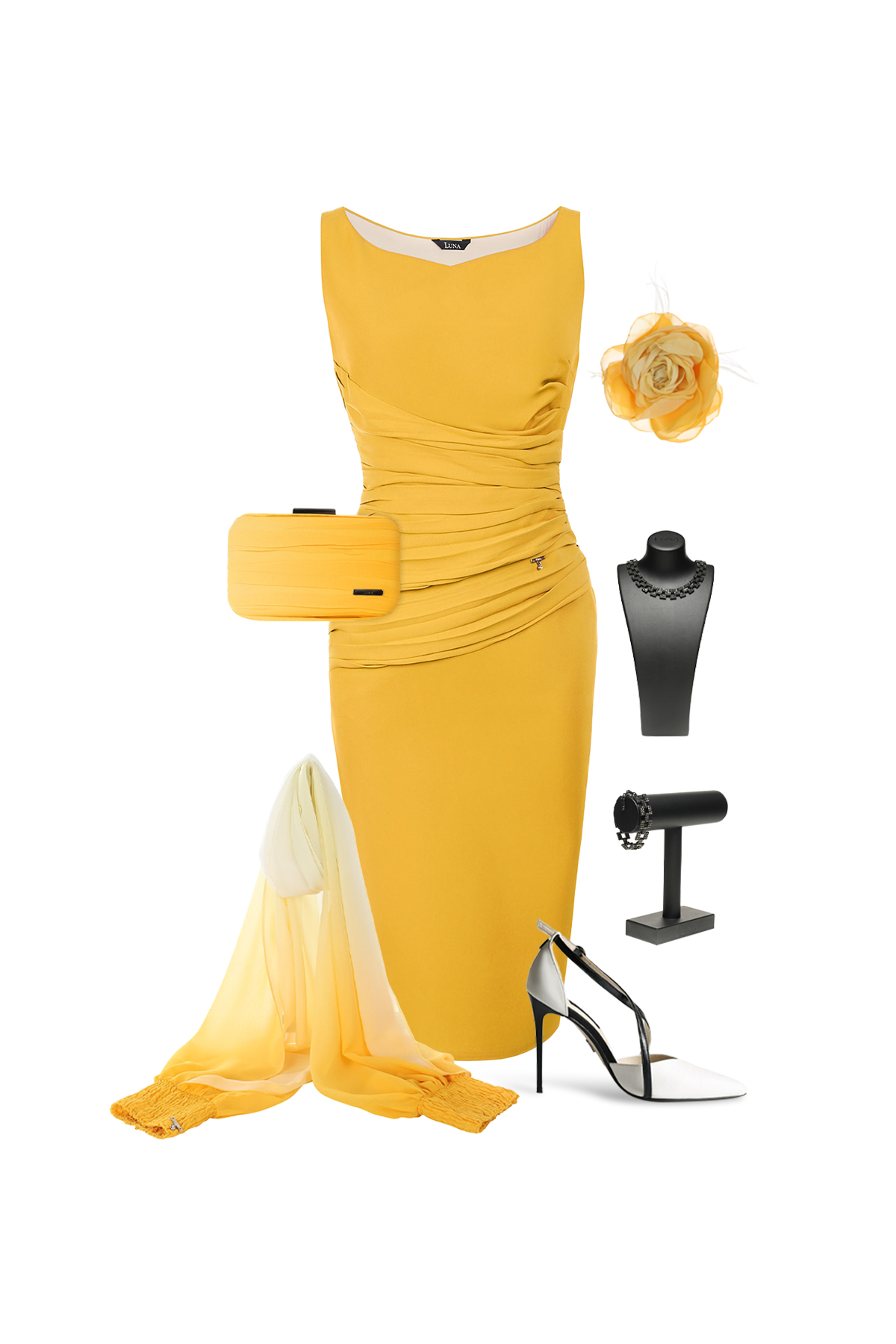 Ozka obleka brez rokavov v rumeni barvi. Gube v predelu pasu dodatno poudarijo vaš pas.